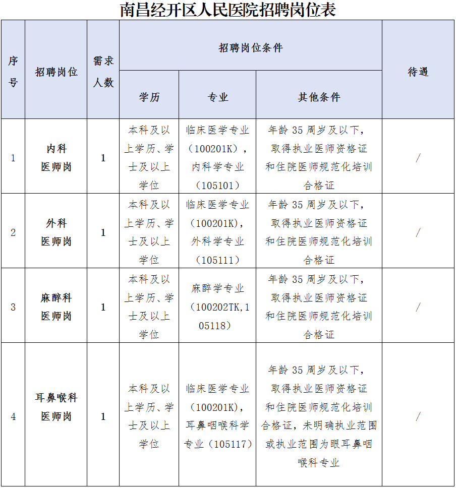 南昌经开区人民医院成立于2021年1月19日,位于南昌经开区双港西大道189号,建筑面积2.17万平方米,院内环境宽敞舒适,人性化设计服务,设床位200张,是经开区首家、南昌市城北片区第一家集医疗、护理、康复、保健于一体的公立综合医院。医院设临床、医技科室22个,配有1.5T核磁共振、64排螺旋CT等先进的诊断治疗设备,按照电子病历过五级,互联互通四乙进行信息化建设,致力于打造智慧化医院。因医院业务发展需要,将面向社会招聘18名专业技术人员,具体公告如下: