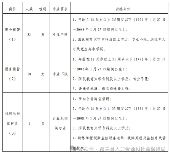 根据《青海省公安机关警务辅助人员管理条例》及相关规定,结合当前公安工作需要,都兰县公安局决定面向社会公开招聘43名警务辅助人员(以下简称“辅警”),现将有关招聘事项公告如下: