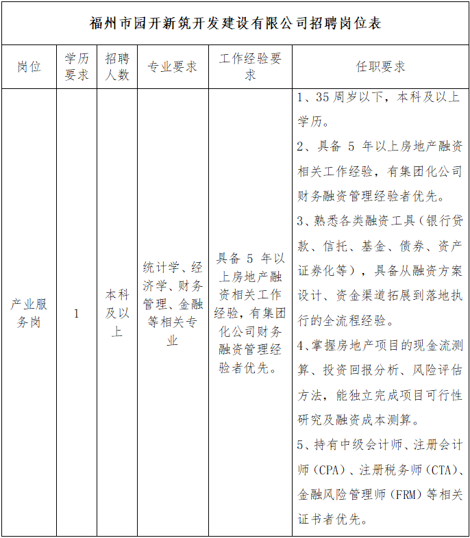 福州市园开新筑开发建设有限公司为福州工业园区开发集团有限公司全资子公司,经营范围包括房地产开发经营、住房租赁、非居住房地产租赁、办公设备租赁服务、物业管理、物业服务评估等。因业务发展需要,公开招聘如下岗位(详见招聘岗位表附件1),现将有关事项公告如下: