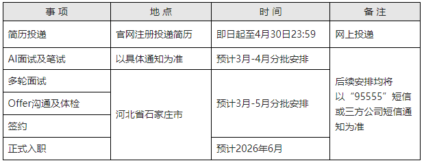 现根据业务发展与人才培养的需要,招商银行石家庄分行面向境内境外院校诚邀2026年毕业生加盟,具体要求如下: