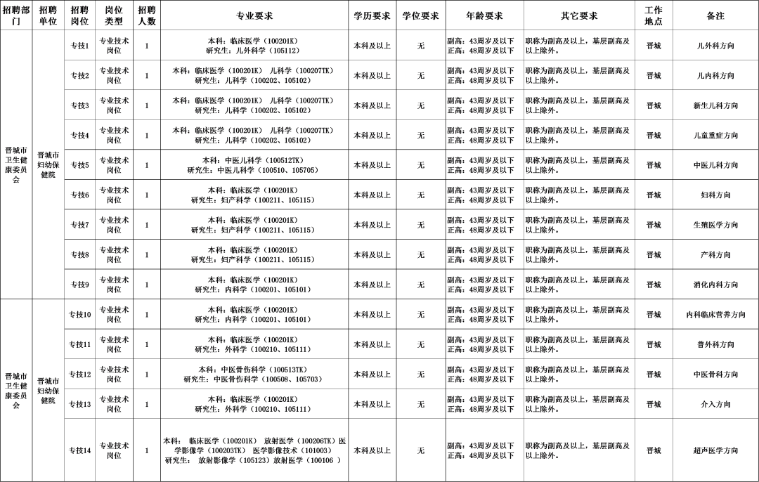 晋城市妇幼保健院2026年公开招聘财政拨款事业编制专业技术人员14人。招聘岗位所需的具体条件以《晋城市妇幼保健院2026年公开招聘专业技术人员岗位表》的要求为准。