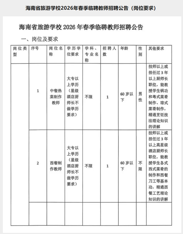 海南省旅游学校2026年春季临聘教师招聘公告(岗位要求)