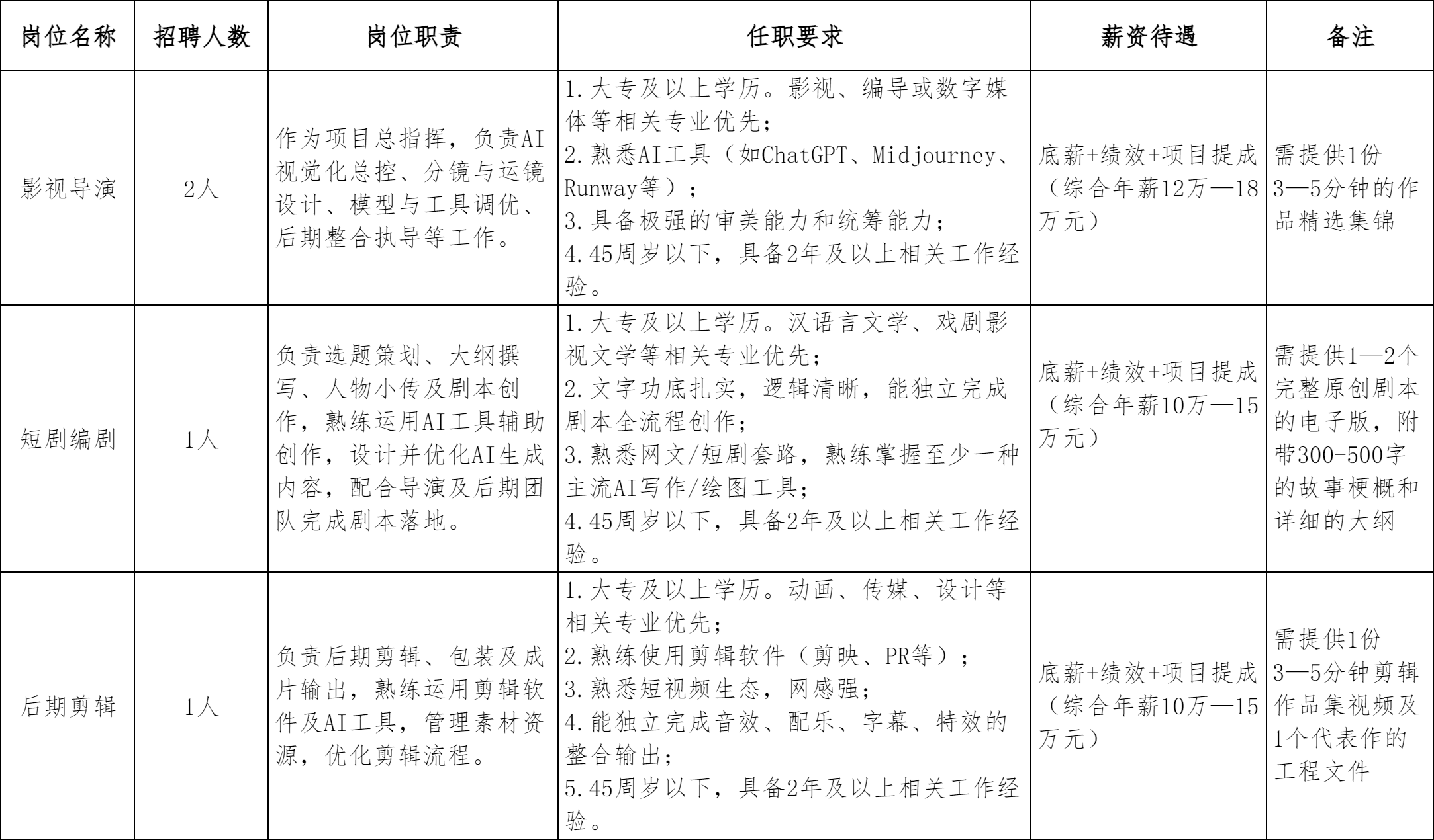 详见附件《吉安市欣荣文化影视有限公司2026年招聘劳务派遣人员岗位及任职要求》。本次招聘岗位年龄计算方法为:45周岁及以下是指1980年1月31日(含)以后出生。招聘岗位要求毕业证书或资格证书获取的时间截至2026年1月31日(含)。特别优秀者经研究决定后可适当放宽相关条件。