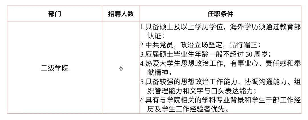 教师岗位(含高层次人才3人、常任轨教师7人、骨干教师22人)32人;辅导员岗位6人。
