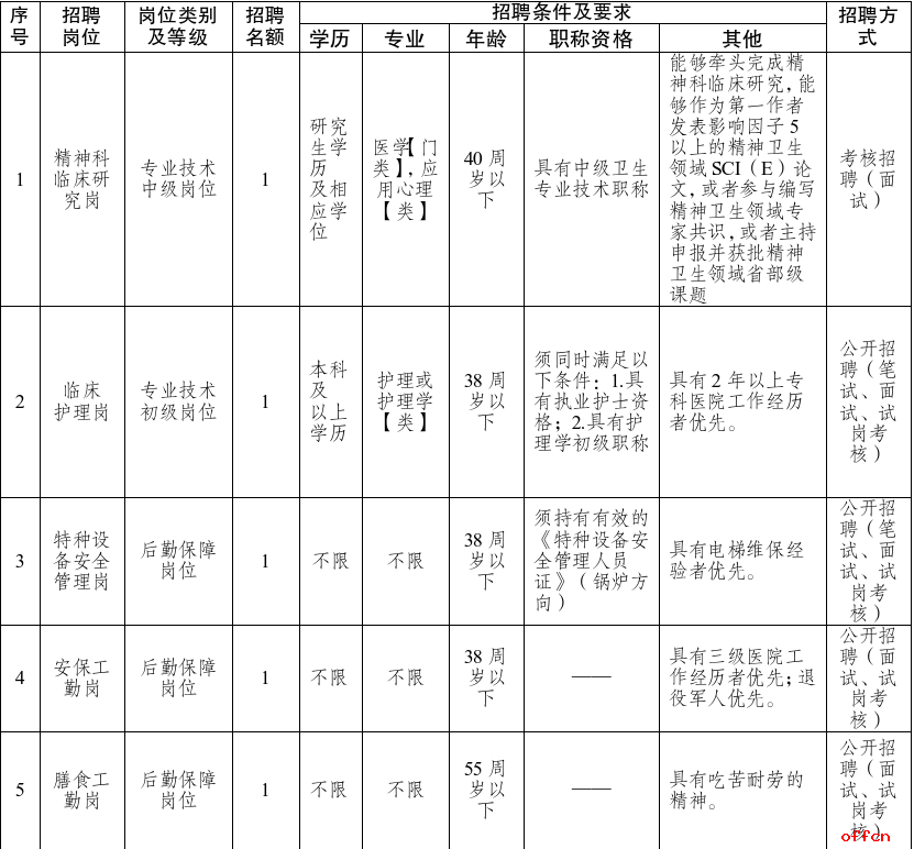 精神科临床研究岗(编外聘用中级专技)1名、临床护理岗(编外聘用初级专技)1名、特种设备安全管理岗(编外聘用工勤)、安保工勤岗(编外聘用工勤)1名,膳食工勤岗(编外聘用工勤)1名。招聘岗位、招聘名额、岗位类别、招聘条件及要求、招聘方式等详见下表。