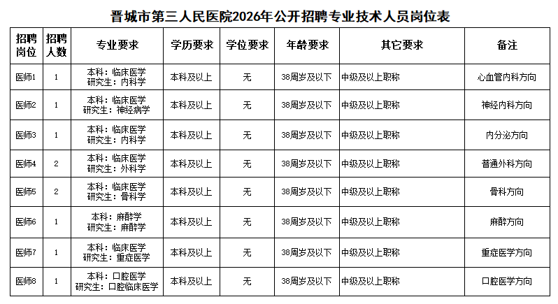 2、报名方式:有意向者请登录http://jcsdsrmyy.cn/网站自行下载并填写《晋城市第三人民医院2026年公开招聘专业技术人员报名表》,填写完毕投递至报名邮箱:jcsdsrmyy@yeah.net,邮件主题请以“姓名+岗位+学历+专业”格式为准。
