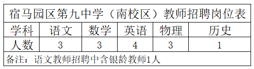 宿州九中(宿马南校区):语文3名,数学3名,英语4名,物理3名,历史1名,总计14人。