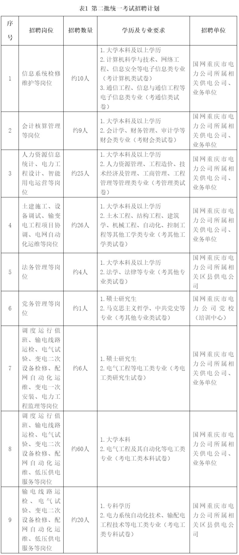 本次第二批招聘单位主体为国网重庆市电力公司所属供电公司、业务单位。其中,业务单位即培训中心、送变电公司等支撑供电业务的相关单位。考生填报志愿选择重庆公司时,任选重庆公司所属供电公司、业务单位,均视为报考重庆公司。具体录用单位,根据考生“笔试+面试”综合成绩排名及公司招聘计划确定。