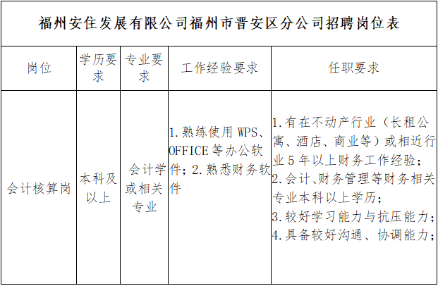 福州安住发展有限公司福州市晋安区分公司会计核算岗1名。具体详见附件岗位表。