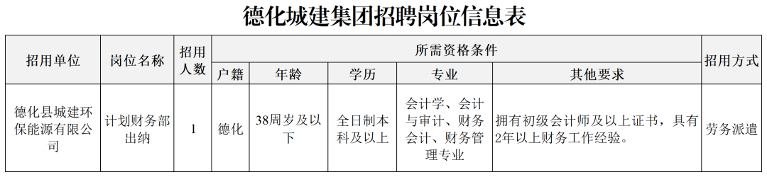 因工作需要,德化城建集团委托德化人力资本有限公司公开招聘劳务派遣人员1名。现将有关事项公告如下: