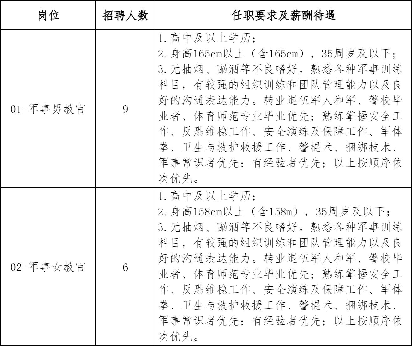 此次聘用人员为劳务派遣人员,军事教官每月工资4000元左右(不含食宿),按有关规定购买五险一金。