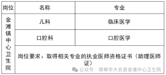大名县金滩镇中心卫生院创建于1956年,坐落于大名县金滩镇金东村106国道东侧,是一所集医疗、预防、中医、康复、急救、医养结合于一体的综合性“一级甲等”基层重点中心卫生院,医院现占地面积8388m平方米,建筑面积4658m平方米,开放床位200张,辖下设23个村卫生室,辖区常住在册服务人口40398人。人员情况:现有干部职工86人,其中:正高级职称1人、副高职称9人、中级职称22人、初级职称20人、其他医技人员28人、行政后勤6人。