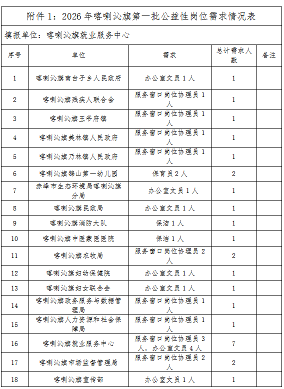 1.《2026年喀喇沁旗第一批公益性岗位需求情况表》