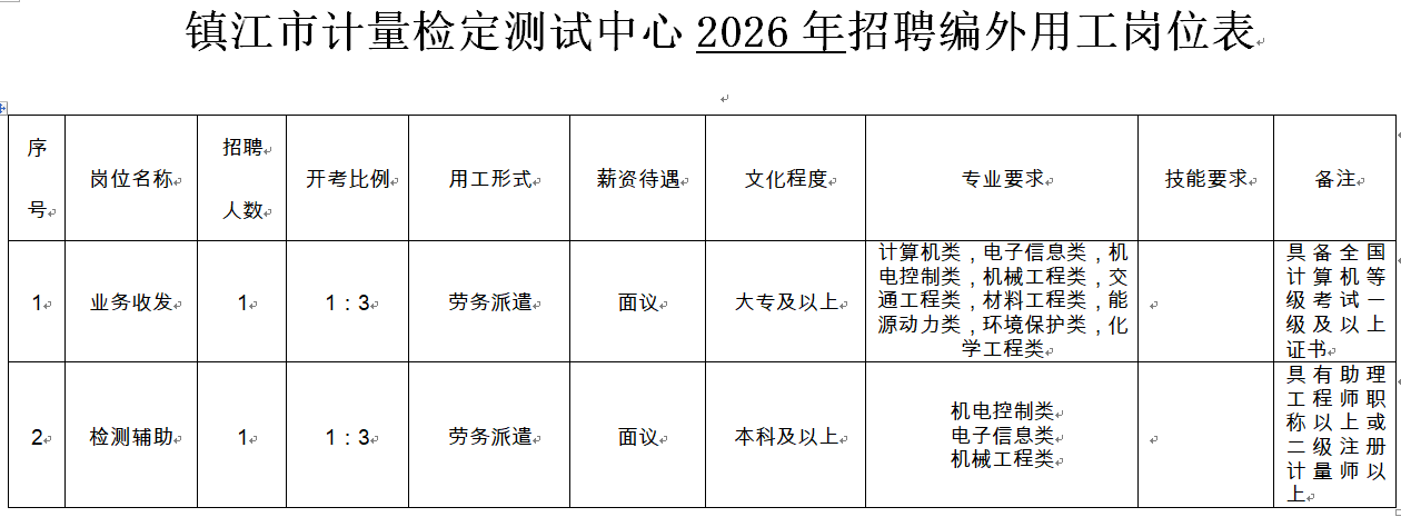 根据《镇江市市级机关事业单位编外用工管理办法》文件精神,结合本单位编外用工空缺和工作需要,镇江市计量检定测试中心决定招聘业务收发、检测辅助岗位编外用工共 2名。