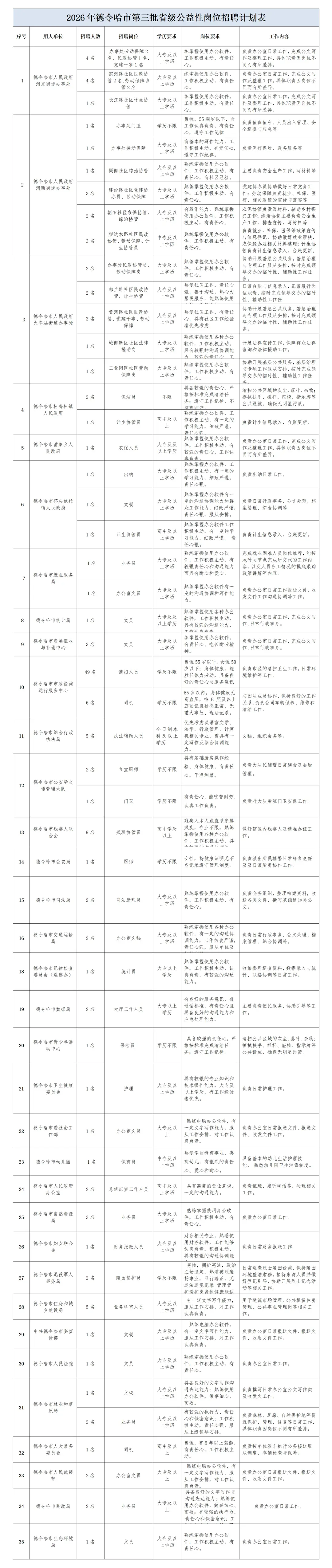 公益性岗位招聘德令哈市户籍及持德令哈市居住证人员,在规定劳动年龄内(16周岁及以上,男55周岁、女50周岁以下)有劳动能力和就业愿望,持青海省内《就业创业证》,被认定为就业援助对象的下列人员: