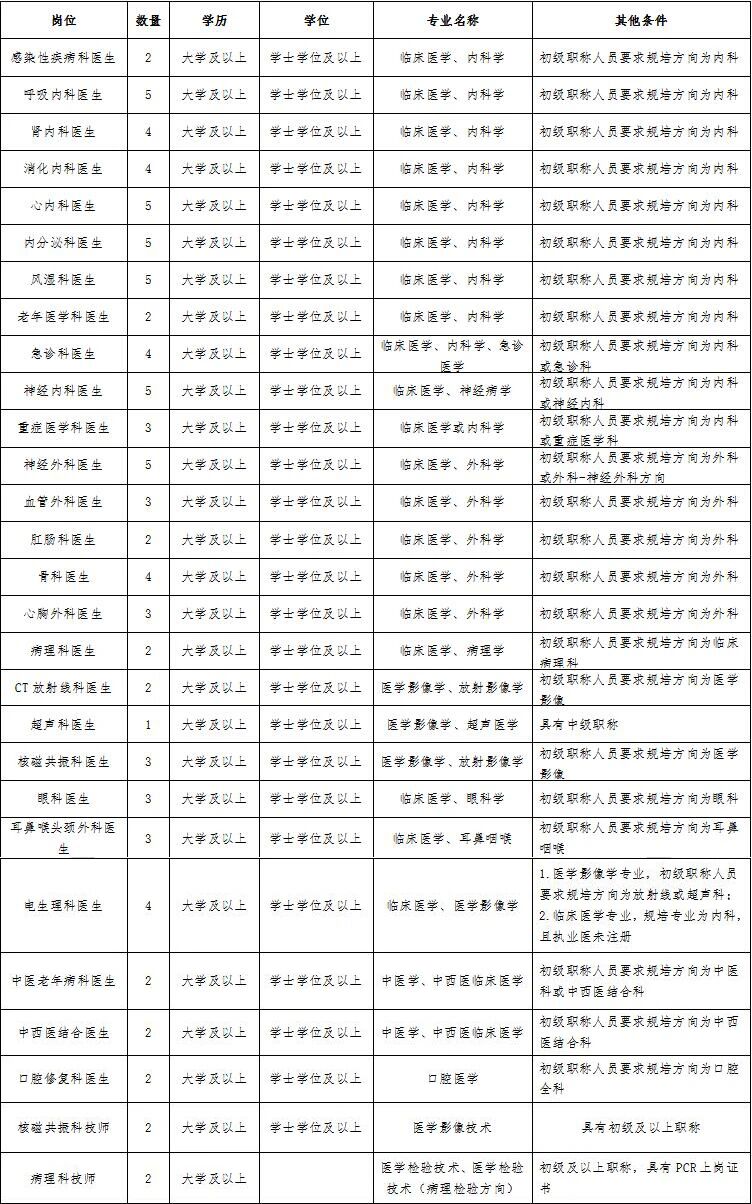 6.医疗岗位学历要求为全日制本科及以上,所学专业及规培专业与招聘岗位专业一致,需取得规培证书或中级及以上专业技术职称,中级及以上职称人员要求资格证专业与申报专业一致。