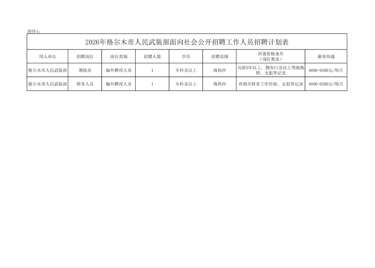 5.岗位具体待遇、学历、岗位要求等细化要求,以附件《2026年格尔木市人民武装部面向社会公开招聘编外聘用人员招聘计划表》具体要求为准。