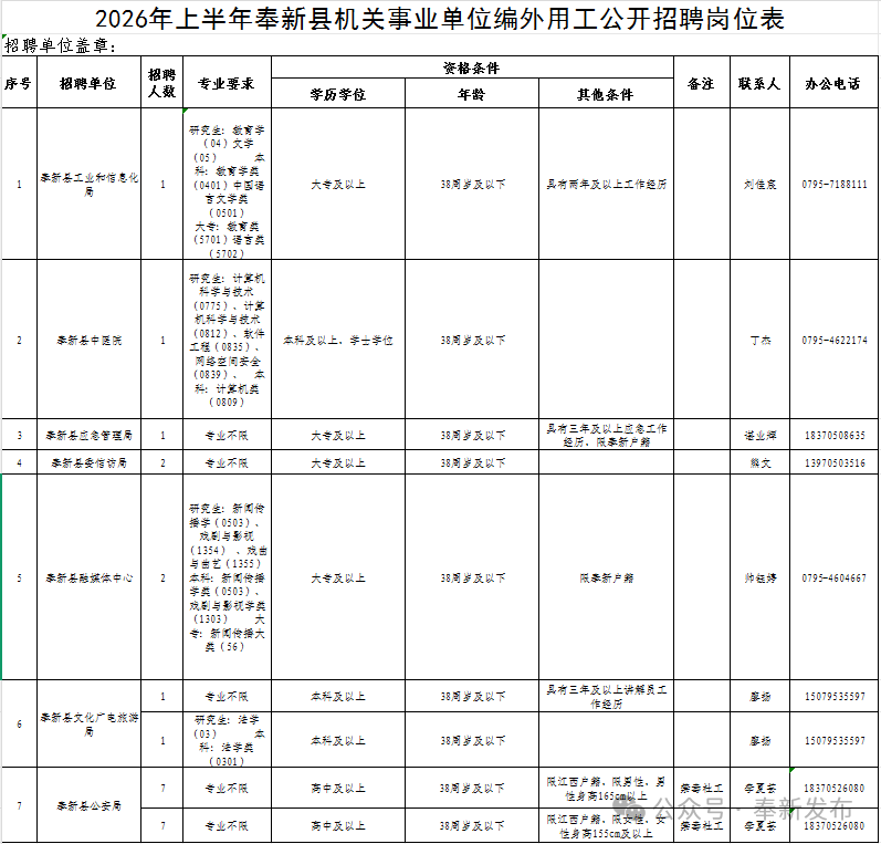 1、2026年上半年奉新县机关事业单位编外用工公开招聘岗位表