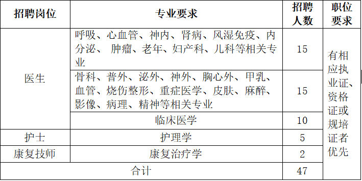 阳煤总院招聘计划共47人,其中医生40人,护士5人,康复治疗师2人,详见下表:
