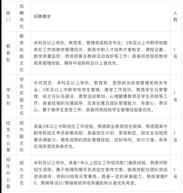一、学校简介 郑州航空港区华师工业智能中等专业学校(简称“郑港华师”),坐落于郑州航空港区洞庭湖路21号,交通便利,地理位置优越。学校聚焦河南省“1+2+4+N”目标任务体系,面向未来学校将布局数字科技、高端装备、新商科、智慧交通、创意设计、公共服务六大核心专业群,致力于培养高素质技术技能人才。 学校秉持“德塑匠心,力行致远”的校训,落实立德树人的根本任务,牢牢把握高技能人才培养的功能定位,夯实基础、全面发力,深化职业教育教学关键要素改革,健全行业、企业、学校合作机制,着力打造河南省内一流、全国知名的现代职业教育标杆,为航空港区及河南省发展提供坚实人才支撑。 为适配学校高质量发展节奏,面向社会诚聘英才!