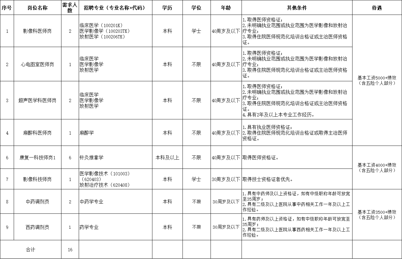 2.薪酬待遇:基本工资3500-5000元/月(具体标准详见《岗位需求表》),绩效工资参照医院绩效考核方案执行;享受工作餐补贴,缴纳社会保险。