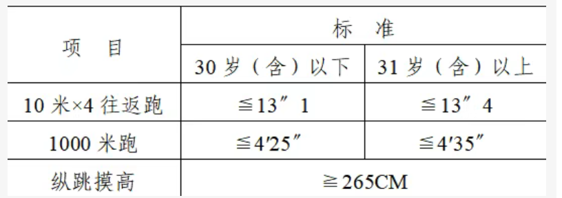 体能测评包括三个项目,分别为纵跳摸高、10米×4往返跑、1000米跑,每个项目测试次数不超过2次。体能测评采用达标制,任意一项不达标的,即为体能测评不合格,不进入下一环节。体能测评不设缓测、补测,达标标准详见下表。