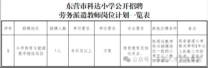 因工作需要,东营市科达小学委托东营市东凯人力资源服务有限公司面向社会公开招聘劳务派遣教师,现将有关事项公告如下: