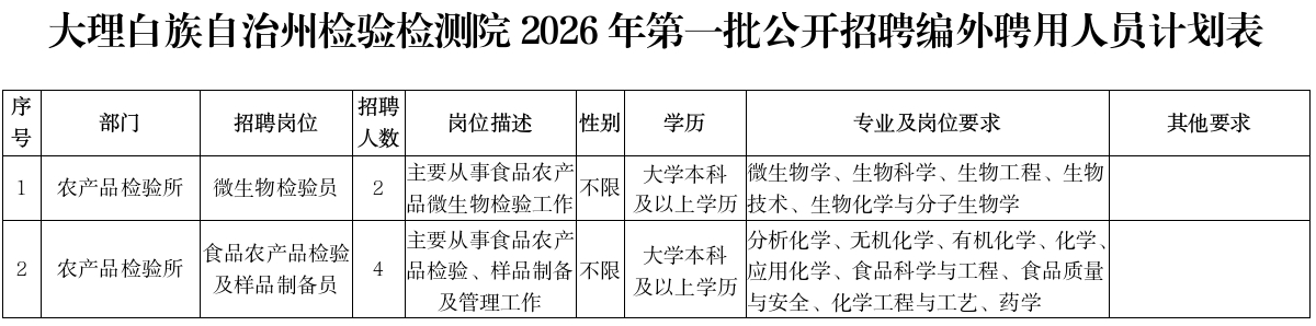 招聘岗位及招聘条件详见《大理白族自治州检验检测院第一批公开招聘编外聘用人员计划表》(详见附件)。