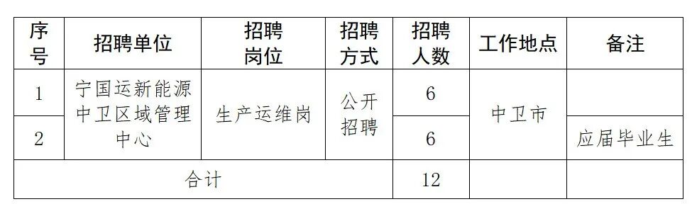 宁夏国运新能源股份有限公司聚焦新能源产业,主营业务涵盖风力发电、太阳能发电及储能电站的开发、建设与运营。宁国运新能源中卫区域管理中心拟公开招聘工作人员12名,现将有关事项公告如下: