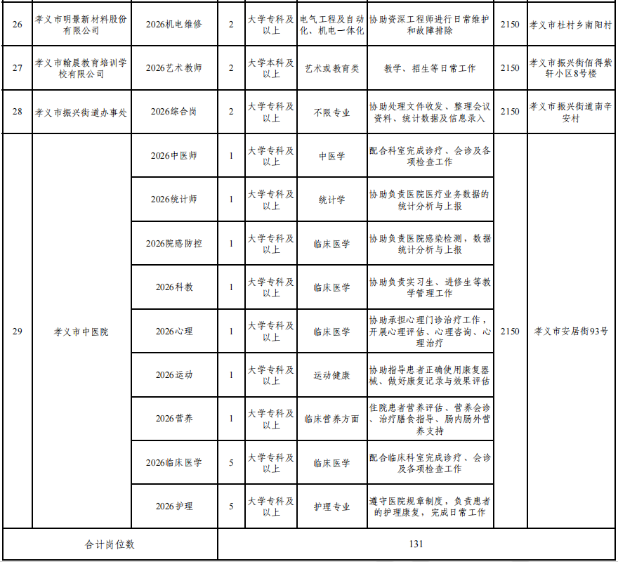 为进一步做好孝义市2026年青年就业见习工作,提升青年综合素质和职业能力,积累工作经验提升就业竞争力,尽快实现就业。现将审核合格的131个就业见习岗位予以公布,并将就业见习报名有关事项公告如下。