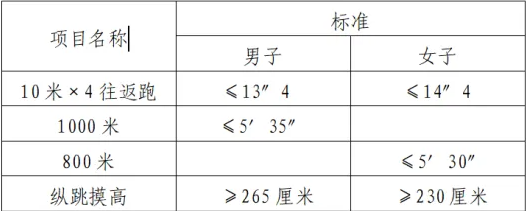体能测评中,每名报考者纵跳摸高测评不超过3次、10米×4往返跑测评不超过2次、1000米(或者800米)跑只测评1次。报考者在各个项目有1次测评达标的,即视为该项目测评通过。