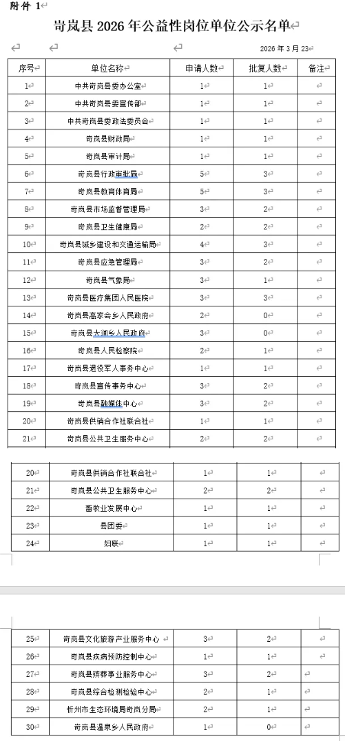为贯彻落实《山西省人力资源和社会保障厅、 财政厅关于印发<城镇公益性岗位开发管理办法>的通知》(晋人社规字〔2025〕3号)、《山西省人民政府办公厅关于印发山西省就业困难人员认定管理办法的通知》(晋政办发〔2024〕33号)和《就业补助资金管理办法》(晋财规社〔2025〕1号)文件精神,进一步做好我县就业困难人员的就业工作,现面向社会公开招聘公益性岗位人员,招聘人数以省市批复的计划数为准,并结合我县实际情况,根据用人单位的实际需求,将分批予以安置。现将具体事宜公告如下: