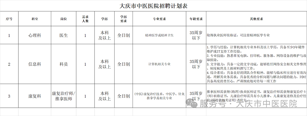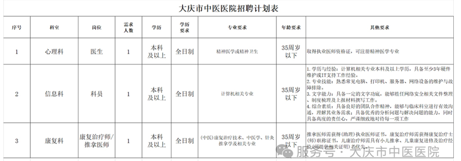 因工作需要,现大庆市中医医院拟招聘工作人员,具体要求如下:
