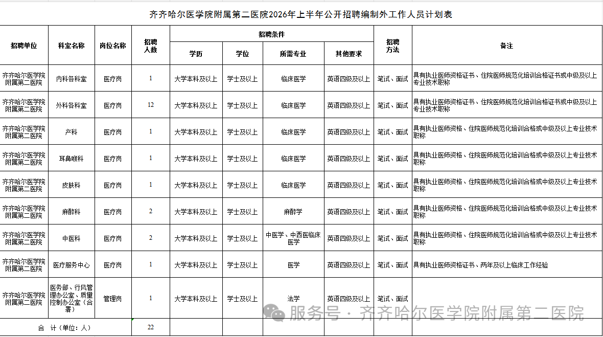 本次计划招聘事业单位工作人员22名,详见《齐齐哈尔医学院附属第二医院2026年上半年公开招聘编制外工作人员计划表》(附表)。