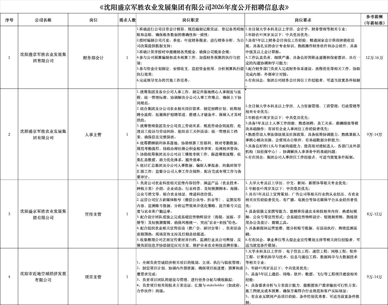 *相关岗位要求详见《沈阳盛京军胜农业发展集团有限公司2026年度公开招聘信息表》及报名网址内详情。