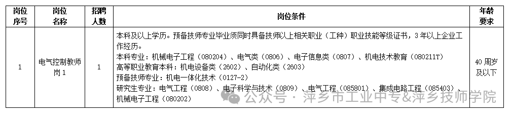 本次招聘电气控制教师岗1人。