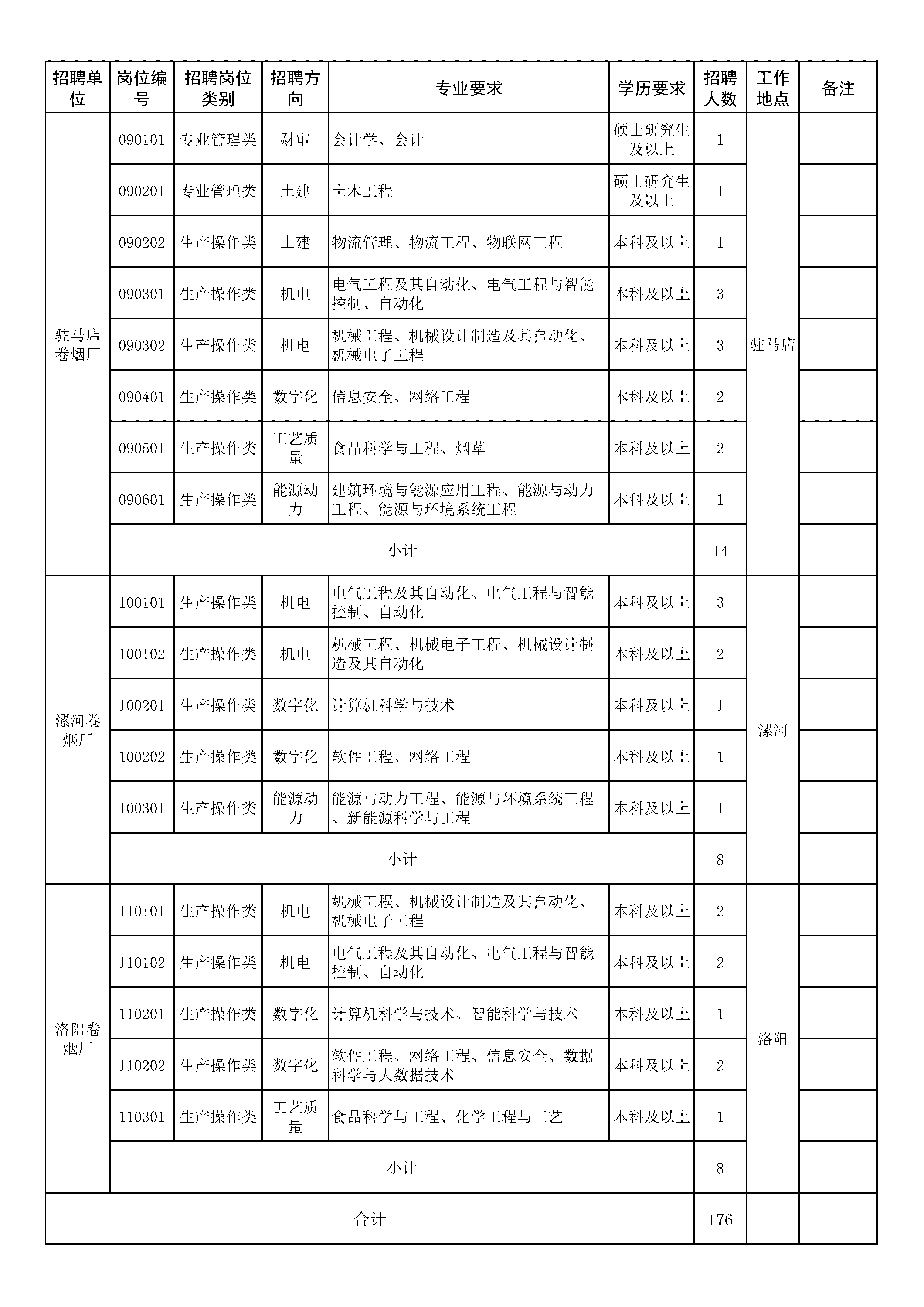 本次共招聘176人,招聘单位、岗位、人数、专业及学历要求见《河南中烟工业有限责任公司2026年大学生招聘计划表》(附件1)。