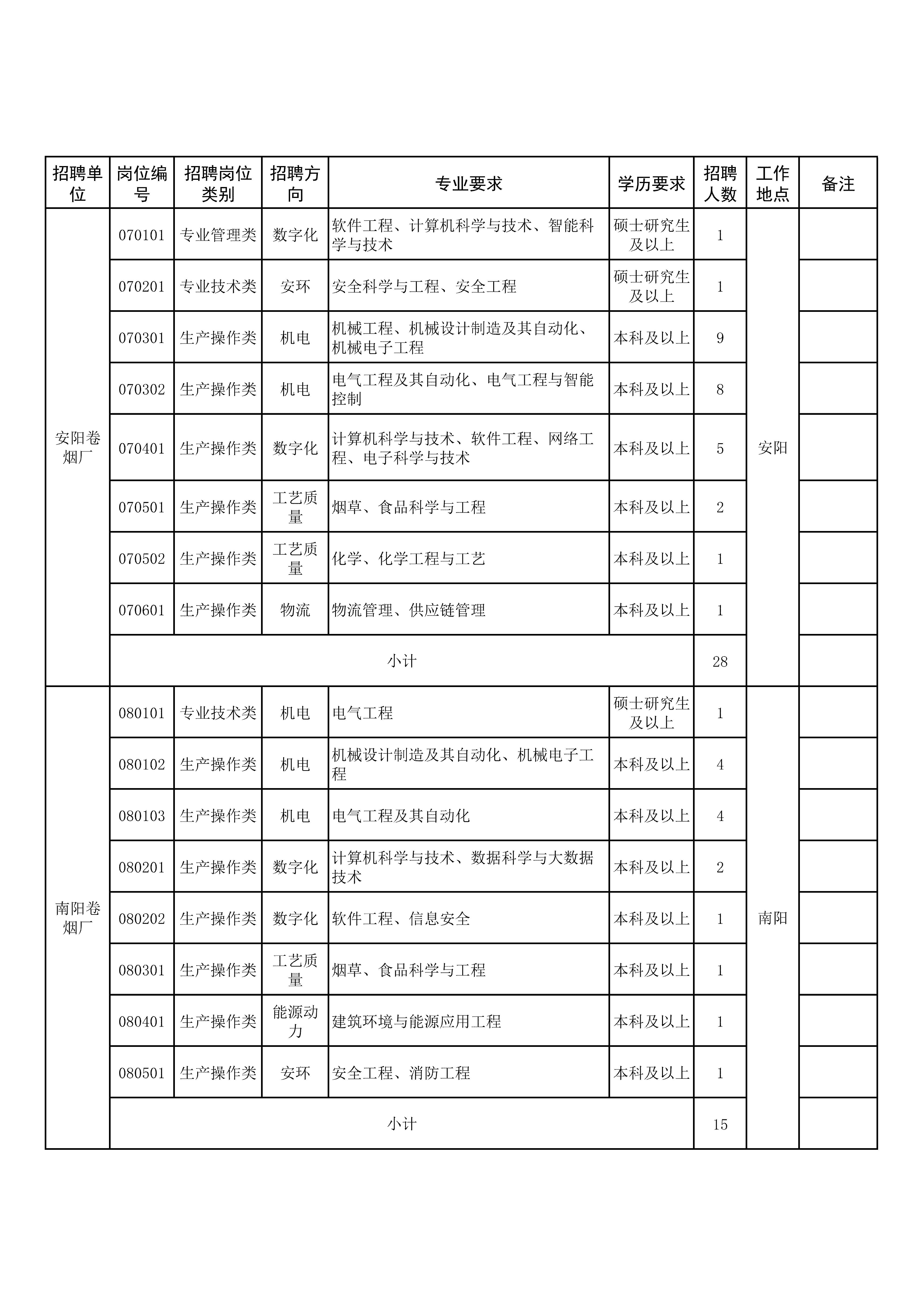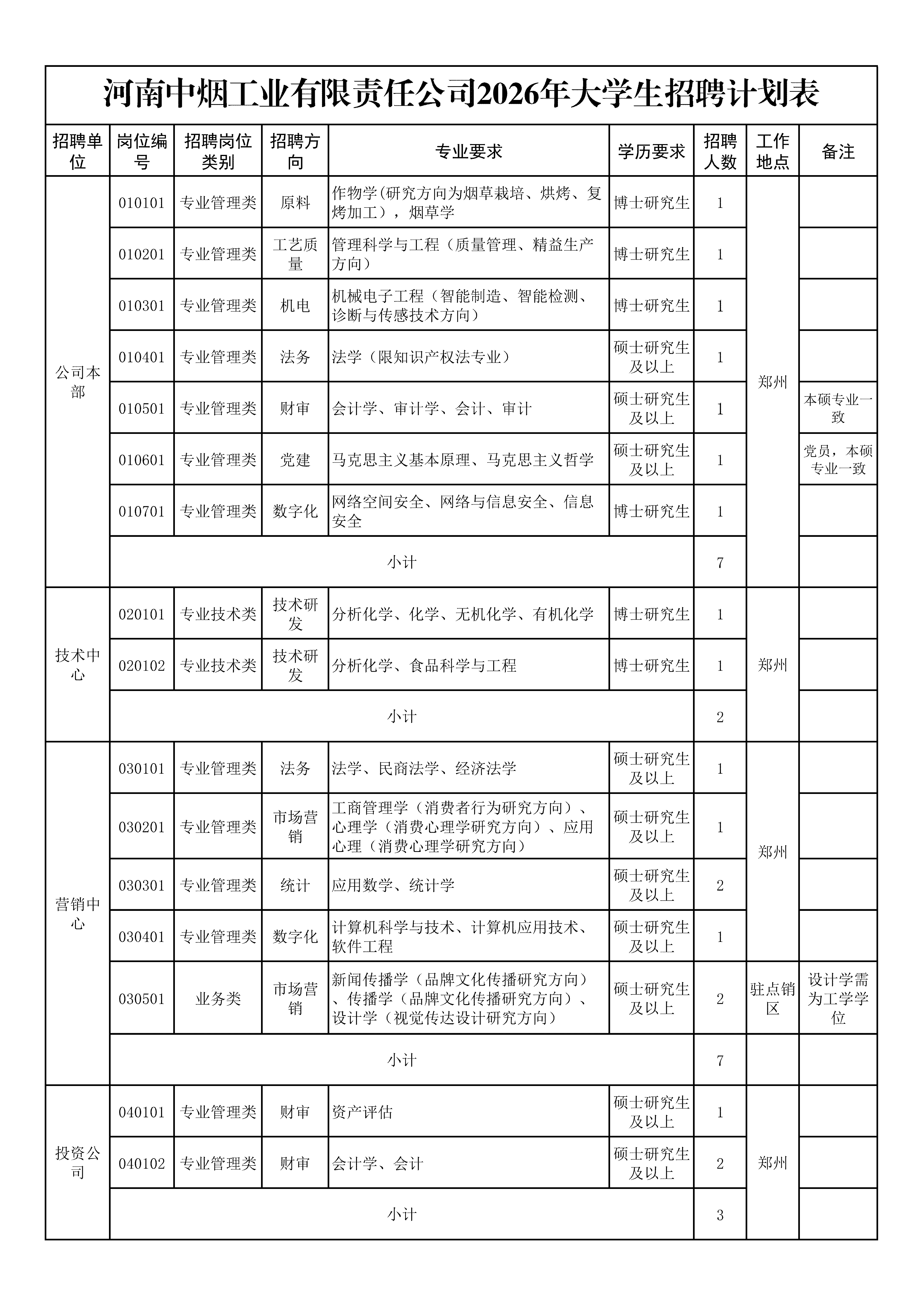 附件1:河南中烟工业有限责任公司2026年大学生招聘计划表