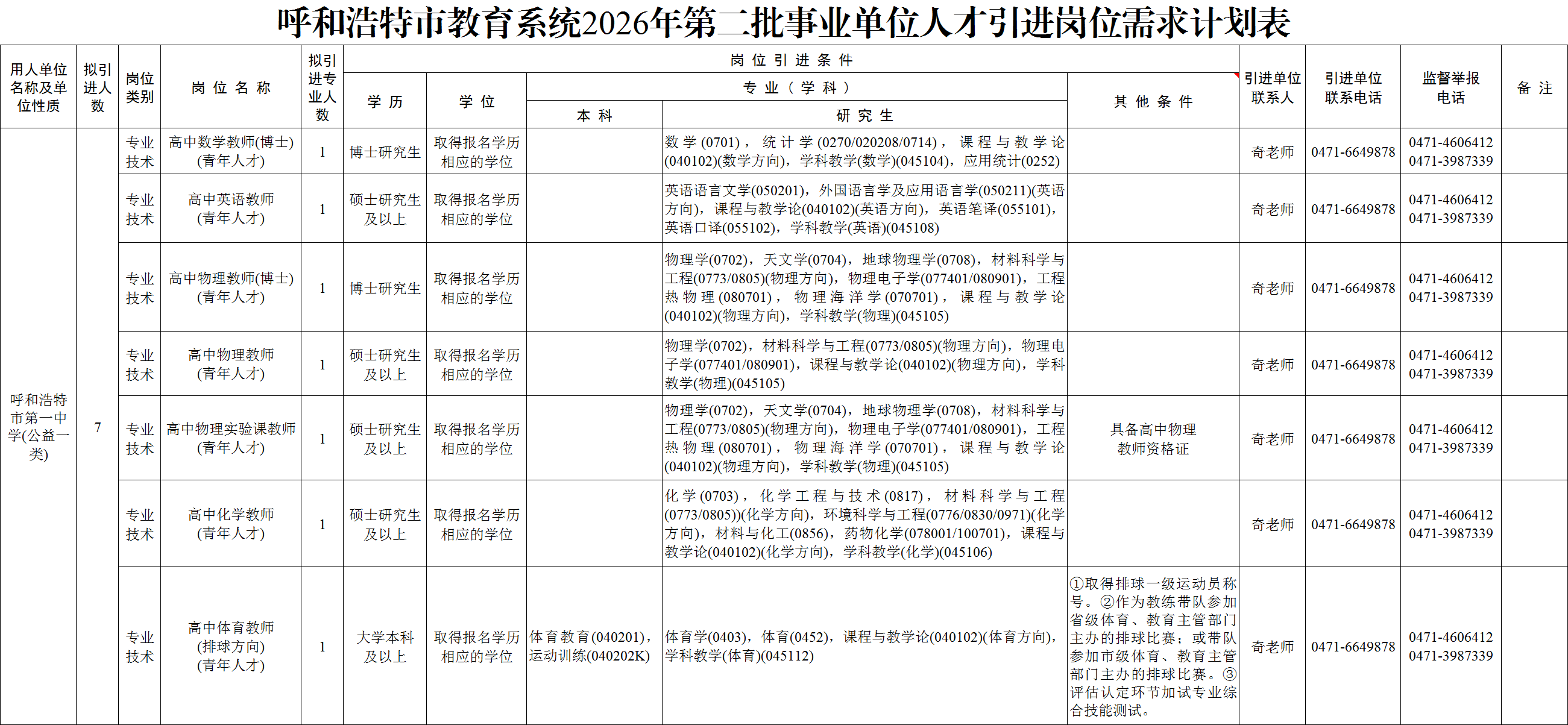 呼和浩特市第一中学始建于1903年,是自治区首批重点中学、首批示范性普通高中,办学底蕴深厚、师资力量雄厚、育人成果丰硕。为深入实施人才强校战略,优化师资队伍结构,助力学校高质量发展,结合呼和浩特市教育系统2026年第二批事业单位人才引进工作安排,现发布我校2026年教师人才引进通知,面向全国诚聘优秀教育人才。