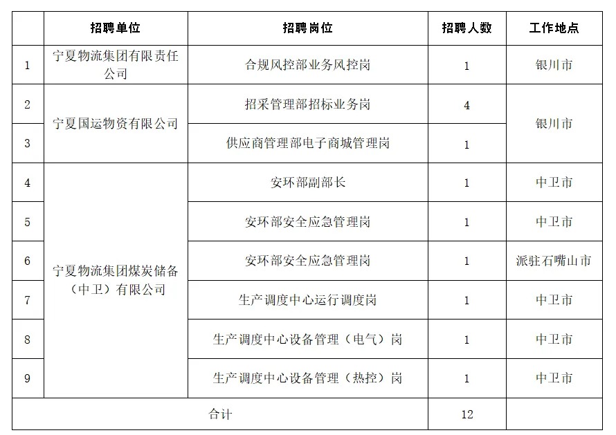 为满足宁夏物流集团公司及权属企业物资公司和中卫公司生产经营需要,拟面向社会公开招聘专业技术人员12名。现将有关事项公告如下: