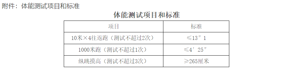(1)体能测试分为合格和不合格,三项全合格者进入笔试。体能测试项目:1000米跑、4×10米往返跑、纵跳摸高。测试标准详见附表(附件)。
