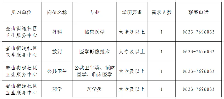 奎山街道社区卫生服务中心始建于1956年,是日照经开区唯一非营利性公立医疗机构。中心开设内、外、全科、口腔、中医、康复等二十余个科室,提供基本医疗、预防保健、慢病管理、公共卫生等服务,用心守护辖区居民健康。为推进高校毕业生就业见习工作,规范和完善我中心高校毕业生见习基地,全面提升自身综合素质和职业能力,结合单位实际工作需要,现面向社会招聘4名见习人员,有关事项通知如下:
