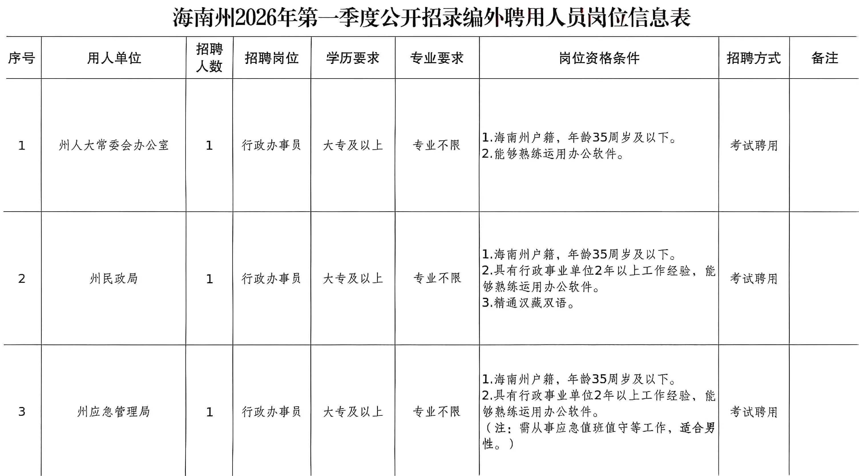 1.海南州2026年第一季度公开招录编外聘用人员岗位信息表