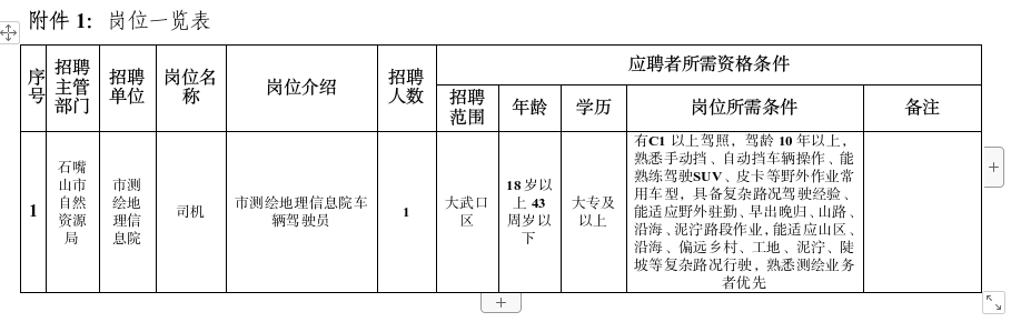 石嘴山市自然资源局公开招录聘用制工作人员计划招聘1人,具体岗位和要求详见《岗位一览表 》(附件1)。