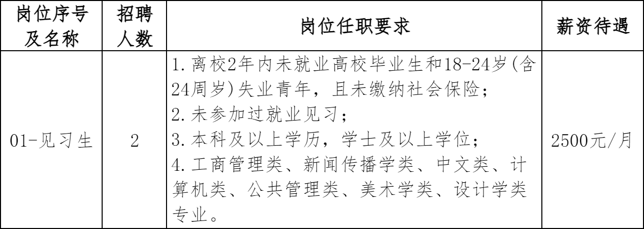详见附件《吉水县城控人力资源服务有限公司2026年招募见习生岗位需求表》。招聘岗位要求毕业证书或资格证书获取的时间截至2026年4月1日(含)。特别优秀者经研究决定后可适当放宽相关条件。