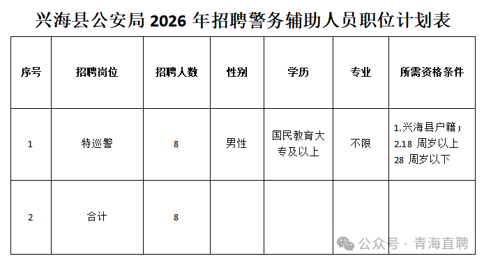 (一)招聘人数。兴海县公安局2026年招聘警务辅助人员特巡警岗位8名,具体招聘职位计划表详见附件1。