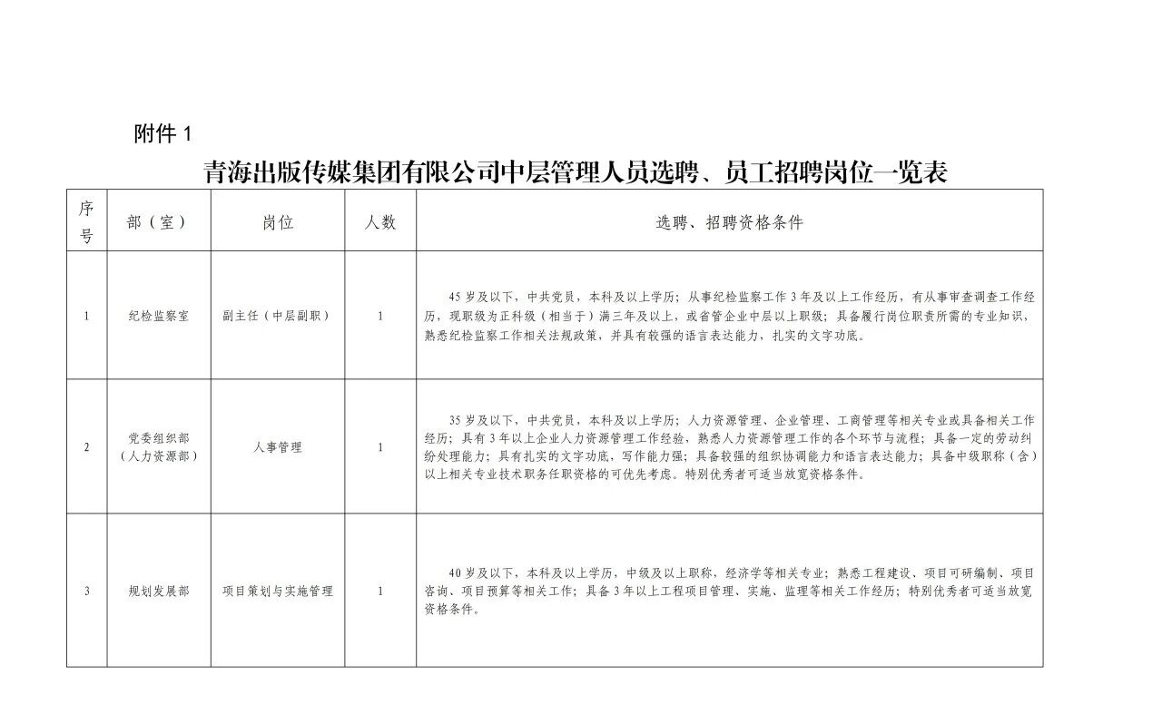3.资格条件:除以上基本条件外,具体资格条件要求详见《青海出版传媒集团有限公司中层管理人员选聘、员工招聘岗位一览表》(附件1)。