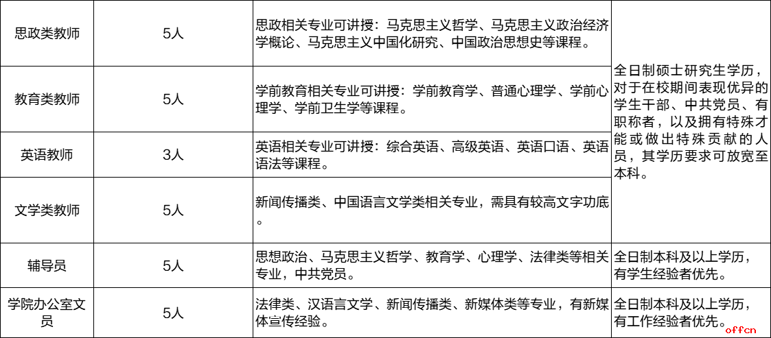 1、教师岗位需全日制硕士研究生学历,对于在校期间表现优异的学生干部、中共党员、有职称者,以及拥有特殊才能或做出特殊贡献的人员,其学历要求可放宽至本科。辅导员岗位、办公室文员岗位需全日制本科及本科以上学历。