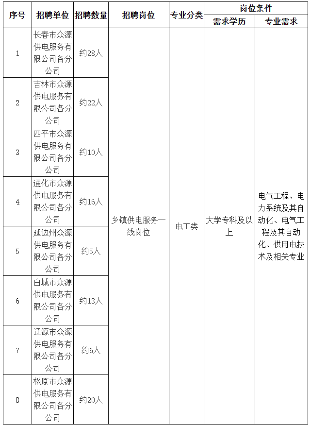 1、招聘范围:2026年全国普通高等院校国家计划内统招的应届毕业生。本批次考试中,国网吉林电力工程集团有限公司所属单位主要面向大学本科及以上学历毕业生,吉林省各市(州)、县众源供电服务(分)公司主要面向大专及以上学历毕业生。同等条件下,退役军人优先录用。