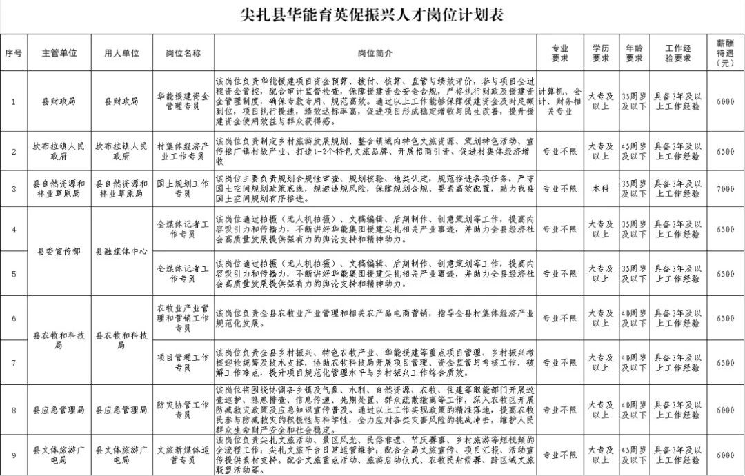 为进一步补充各单位用人需求,持续优化全县人才结构,切实提升人才赋能乡村振兴工作质效,依据“公开、平等、竞争、择优”原则,参照机关事业单位考录招聘程序,尖扎县面向社会公开招聘华能育英促振兴人才9名,现将有关事项公告如下: